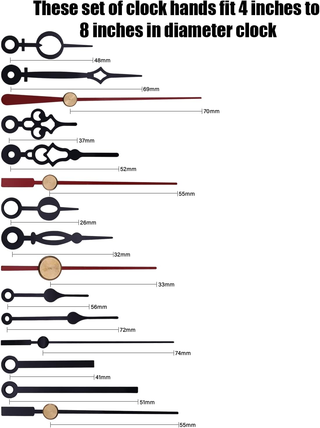 Perfect for clocks ranging from 4 to 8 inches in diameter, these hands are engineered to complement any design. Whether youâre aiming for a modern, minimalist look or something more traditional, the variety of styles ensures your clock stands out and reflects your personal taste.